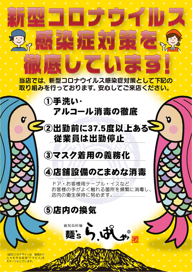 新型コロナウイルスなどの感染症予防及び拡散防止のための麺’sら.ぱしゃの取り組み。